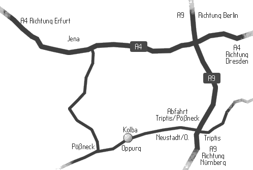 Von der A4 (Eisenach - Dresden) nehmen Sie die Ausfahrt Jena und fahren über die B77 in Richtung Rudolstadt bis Orlamünde. In Orlamünde fahren Sie durch das landschaftlich schöne Orlatal in Richtung Pößneck. Vom Ortseingang Pößneck sind es noch 3km auf der B 281 in Richtung Neustadt/Orla. Von der A 9 (Berlin - München) können Sie die Abfahrt Triptis nutzen und fahren auf der B 281 ca. 19 km bis Sie Oppurg erreicht haben. |