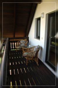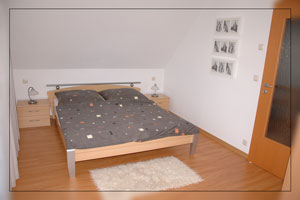 Der Schlafbereich verfügt über ein Doppelbett, im Bedarfsfall ist eine Aufbettung möglich, es kann jedoch auch die Schlafcouch im Wohnzimmer genutzt werden. Vom Schlafzimmer gelangt man auf einen gemütlichen Balkon mit Blick ins Grüne. |